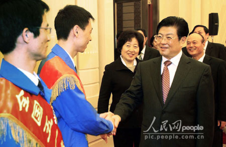 2007年4月24日,中共中央政治局委員、全國人大常委會副委員長、中華全國總工會主席王兆國親切接見“袁政海班組”代表。(工人日報記者許之豐攝)