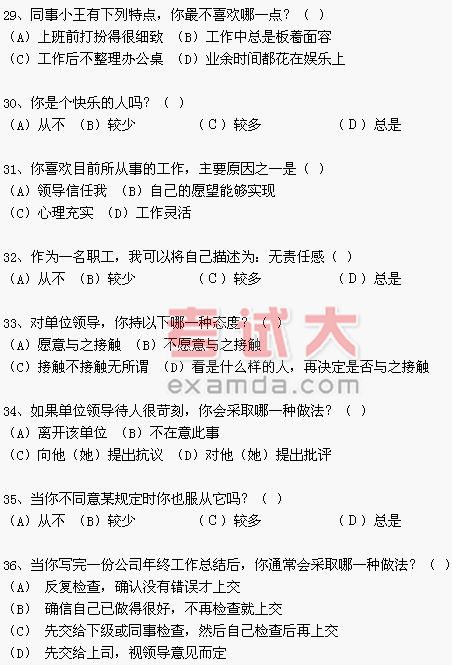 28、在某同事的行為表現中,你最不能容忍的一種做法是( )。 (A)一分鐘也不提前崗 (B)與別人交往多,但與我交往少 (C)穿著打扮總是很入時 (D)老是加班