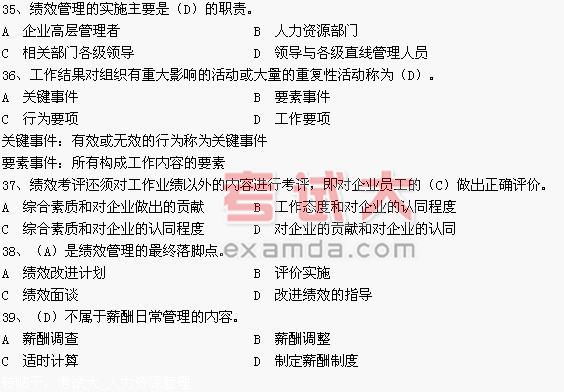 一、單選題(1—60小題,每題1分,共60分。每小題只有一個最恰當的答案,請在答題卡上將所選答案的字母涂黑) 1、需要采集有關自變量和因變量資料的調查研究是(A)。 A 因果關系調研 B 描述性調研 C 預測性調研 D 探索性調研 2、屬于書面調研報告的主要內容(C)。 A 調研的時間進度 B 調研的內部因素 C 調研的方式方法 D 調研的外部因素 3、目前我國市場配置人力資源的基本原則是(C)。 A 確保質量 B 降低成本 C 雙向選擇 D 德才兼備 4、信息具有滯后性的原因是(B)。 A 信息流總落后于資金流 B 信息流總落后于物流 C 物流總落后于信息流 D 資金流總落后于信息流 5、信息的準確性的另一個含義是(A)。 A 同一信息具有統一性或唯一性 B 同一信息具有完整性或唯一性 C 同一信息具有唯一性或連貫性 D 同一信息具有完整性或連貫性 6、企業管理體制中的“制”指的是(A)。 A 企業組織的無形部分 B 中層管理者之間的關系 C 不同管理單元的溝通 D 決策層對整個企業的控制力 7、企業組織的層次與管理幅度的關系是:管理幅度越大,管理的層次(B)。 A 越多 B 越少 C 可能多可能少 D 不變 8、在工作豐富化過程中,應考慮的因素有(A)。 A 多樣化和任務的整體性 B 多樣化和任務的協調性 C 任務的整體性和任務的趣味性 D 多樣化和任務的趣味性 9、崗位設置的基本原則是(C)。 A 因人設崗 B 因制設崗 C 因事設崗 D 因利設崗 10、企業各部門對員工的補充需求量主要包括(A)。 A 由于實際發展所必須增加的人員和由于“自然減員”所需補充的人員 B 由于企業經濟性裁員后所需要增加的人員和由于“自然減員”所需補充的人員 C 由于實際發展所必須增加的人員和由于企業經濟性裁員后所需要增加的人員 D 由于勞動力價格下降所增加的人員和由于企業經濟性裁員后所需要增加的人員 11、人員招聘的最終目的是(D)。 A 保證組織有足夠的人力需求 B 選擇素質高、質量好的人才 C 招聘到最優的人才 D 達到組織整體效益的最優化 12、人員配置的根本目的是(A)。 A 使得個人能力水平與崗位要求相適應 B 為任何人找到和創造發揮作用的條件 C 通過個體之間取長補短形成整體優勢 D 保持所有員工的身心健康 13、招聘一般專業技術人員通常采取的(b)途徑 A 獵頭公司 B 人才交流中心 C 熟人推薦 D 大學校園 14、以下關于推薦法的闡述中,不正確的是(C)。 A 使用推薦法招聘成功的概率較大 B 使用推薦法招聘對候選人的情況比較了解C 使用推薦法招聘成本較高 D 使用推薦法招聘人員素質高,可靠性強 15、與簡歷相比,單位設計的申請表往往(D)。 A 沒有統一的標準 B 沒有簡歷有效 C 增加預選的時間 D 有利于準確了解候選人的信息 16、面試開始時應從應聘者(A)開始發問。 A 可以預料到的問題 B 最預想不到的問題 C 最難于回答的問題 D 簡歷中有疑問的地方 17、在應聘人員較多的情況下,為了在短時間內篩選一部分人員最好采用(B)。 A 面試 B 筆試 C 情景模擬 D 心里測試 18、一般來說,(D)不適于采用情景模擬測試方法進行挑選。 A 服務人員 B 事務性工作人員 C 管理人員 D 技術操作人員 19、心理測試的結果是對應聘者的(D)的一種評定。 A 智力水平和個性差異 B 智力特征和發展潛力 C 能力特征和個性差異 D 能力特征和發展潛力 20、通過計算(B)可以分析招聘信息發布的效果。 A 招聘單價 B 應聘比例 C 招聘完成比例(超額完成) D 錄用比例(素質高) 21、在考察應聘者的工作能力、工作經驗時,最好根據(C)。 A 應聘職位要求進行假設式提問 B 應聘職位要求進行清單式提問 C 應聘者過去工作行為進行舉例式提問 D 應聘者過去工作行為進行開放式提問 22、招聘會的組織能力如何,社會影響力有多大,指的是(A)。 A 招聘會的檔次 B 招聘會面對的對象 C 招聘會的組織者 D 招聘會的宣傳 23、確定員工發展目標時應把其(A)作為重點考慮。 A 個性 B 共性 C 可塑性 D 成長性 24、檢測受訓者對培訓的參與熱情和持久性,可了解受訓者對培訓項目的(B)。 A 接受程度 B 認知程度 C 抵觸程度 D 把握程度 25、在公司大規模投入資源前可通過(A)的培訓,評價一小部分受訓者所獲得的收益。 A 實驗性 B 操作性 C 技術性 D 練習性 26、對培訓對象的培訓需求進行分類,要求各類培訓對象的培訓需求有(A)。 A 類似性 B 一致性 C 多樣性 D 特殊性 27、(B)用來評價技術或運動技能以及行為方式的水平。 A 認知成果 B 技能成果 C 績效成果 D 情感成果 28、(B)是一種最原始、最基本的需求調查工具之一,其優點在于培訓者與培訓對象親自接觸,對他們的工作有直接的了解。 A 問卷法 B 觀察法 C 訪問法 D 記錄法 29、為了保證培訓取得預期的效果,就必須對培訓進行(D)監控和評估。 A 部分 B 整體 C 階段 D 全程 30、通過(C)獲得的信息可以幫助負責培訓的人員安排各項訓練活動的先后次序。202頁 A 問卷調查法 B 集體訪問法 C 工作盤點法 D 績效分析法 31、當由咨詢人員或其他的外部供應商來提供培訓服務時,很重要的一點就是要考慮培訓項目是針對本企業的(B)。 A 一般需要 B 特定需要 C 個別需要 D 普遍需要 32、在制定績效管理方案時,應根據績效管理的(A)合理地進行方案設計。 A 目標和要求 B 指標和要求 C 目標和內容 D 指示和內容 33、績效管理制度作為績效管理活動的指導性文件,在擬定起草時,一定要從企業(D)出發。 A 生產規模和管理工作水平 B 實際