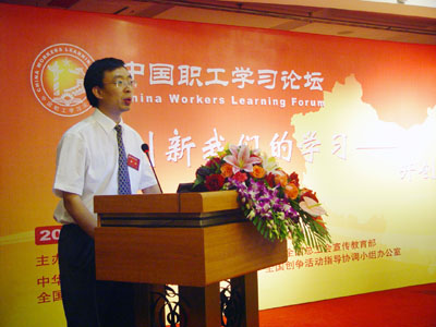 葛道凱在論壇上做了題為《讓電大的現(xiàn)代遠(yuǎn)程教育成為職工學(xué)習(xí)的伙伴》的主題報告。他強調(diào),終身學(xué)習(xí)是時代的主流,越來越多的職工已經(jīng)認(rèn)識到學(xué)習(xí)是穩(wěn)定工作的保證,學(xué)習(xí)是把握命運的基石,學(xué)習(xí)是現(xiàn)代公民的生活方式。他分析了當(dāng)前職工學(xué)習(xí)的現(xiàn)狀和存在的問題,并對中央電大遠(yuǎn)程開放教育和首都職工素質(zhì)教育工程進行了詳細(xì)介紹,指出首都職工素質(zhì)工程創(chuàng)建了職工教育的新模式,即工會、政府、教育機構(gòu)和企業(yè)聯(lián)合;社會化的培訓(xùn);充分發(fā)揮各種優(yōu)質(zhì)教育資源的作用;靈活的教學(xué)模式、規(guī)范化的教學(xué)管理、嚴(yán)格的考試制度,保證了教學(xué)質(zhì)量;搭建了適合職工終身學(xué)習(xí)的通道。談到下一步的發(fā)展,葛道凱強調(diào),中央電大將本著貼近實際、方便靈活、整合資源、周到服務(wù)的原則,進一步搭建課程平臺、加強課程開發(fā)、完善網(wǎng)上教學(xué)平臺,他表示,中央電大愿意與有關(guān)部門、行業(yè)和企業(yè)進行合作,擴大職工的受益面,并且準(zhǔn)備在全國電大系統(tǒng)推廣素質(zhì)教育工程的成功經(jīng)驗。