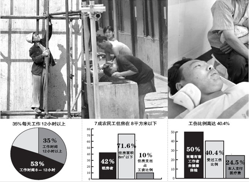 農民工工作的環境也不盡如人意。據武漢市總工會調查,有50%從事有毒有害工作的農民工沒有進行過健康檢查,農民工本人或同事受過工傷的比例高達40.4%,其中24.5%的人醫療費由農民工本人支付。