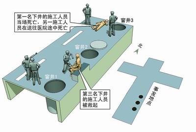 【現場】農民工下水道施工窒息身亡 昨日上午10時30分許,鄭州市南三環與向陽路交*口向南300米路東,靠近路邊圍了很多人,一個個表情嚴肅。人群中,一個窨井蓋大開著,散發出陣陣惡臭。從上面可以看到,約5米深的下水道里,一名男子仰面躺著,污水從他身邊“嘩嘩”地向北流去。 往南看,還有兩個窨井蓋被打開。在中間的一井口周圍,還堆放著一些施工工具。路邊,鄭州市第二人民醫院的醫護人員正在搶救一名男子。過了幾分鐘,男子被醫護人員拉走。 據醫護人員講,之前已經有一名工人被120車拉走治療。 10分鐘后,二七消防一中隊的隊員,戴著空氣呼吸器,慢慢下到井底,用繩子系著男子的腰。5分鐘后,男子被拉出窨井。醫護人員對男子進行搶救后,搖搖頭,宣布男子已經死亡。 【進展】倆救援工友一死一傷 事后,記者了解到,第二個被醫護車拉走的農民工,在半路上搶救無效死亡,被直接送到了太平間。 在鄭州市第二人民醫院高壓氧治療中心,第一個被送往醫院的男子正在高壓氧艙接受治療。 據中心副主任楚金婷講,男子被拉來時處于昏迷狀態,小便失禁,渾身抽搐。經治療,男子漸漸平靜下來,緊緊抓著身上蓋著的被單。11時49分許,男子被抬出高壓氧艙,送進觀察室。 男子稍微平靜下來后,稱他叫馮西明(音),臨潁縣人。據他講,上午9時40分許,他們在疏通下水道。打開井蓋讓窨井通了會兒氣,王宏普(音)就開始下井。剛下到井的一半位置,“撲通”一聲栽了下去。王在井底一動不動,一會就被水流沖進了下水道。 看見同伴掉進去,工友鄭建德(音)下去救,也栽了下去!拔蚁氯ゾ龋蛛U些栽進去,幸好被井上的人拉住拽了上來!瘪T西明說。 由于馮西明情緒不穩定,具體的一些細節還不清楚。 據其他工人講,兩人掉下去后,他們順著水流的方向往北掀窨井蓋。連續掀開了約200米路面上的兩個窨井蓋后,才找到兩人。 【市政】與施工方的安全協議落實不了 在鄭州市第二人民醫院,一名穿深藍T恤的男子是市政局工作人員。他說,這項工程承包給了施工方。為了保證施工安全,市政和施工方還簽有安全協議,平時也會對工人進行施工安全教育。發現工人穿拖鞋、不安全用電等行為時,市政也給施工方開過罰單。但安全協議老是落實不了。 “誰都想追求利益最大化。”穿深藍T恤的男子如此解釋事故頻發的原因。同時,他將市政局安檢科科長陰金山的聯系方式告訴記者,稱具體情況他更清楚。而陰金山稱,“我們經常突擊檢查,并沒有發現過什么問題。施工現場有我們市政工作人員監督! 【農民工】安全培訓只是簡單提醒 據鄭州市第二人民醫院高壓氧治療中心副主任楚金婷講,在坑道作業更要防止沼氣中毒。人在缺氧的環境下,生命隨時都會有危險。 “打開窨井蓋后,井底的有害氣體比空氣重,并不能散開。下井作業時,最好先給井下通氧氣,或者戴上防毒面具。最簡單的方法就是系一根點燃的蠟燭下去。如果蠟燭熄滅,說明下面是危險的!背疰谜f。 如此簡單的方法,為何工人都不知道使用?在作業前,工人都沒有相關的安全培訓嗎? 老劭是受傷農民工馮西明的老鄉。他說,他們從臨潁來鄭州后,就在解放路勞務市場等活。誰有活就跟誰走。無論是工地搞建筑活或者掏下水道,只要能掙到錢,他們也很少在意是否安全。而且,施工人員也沒有給他們培訓什么,頂多提醒一下注意安全。 【求證】兩死一傷還是一死兩傷? 馮西明躺在病床上喃喃自語的時候,市政總公司的一男一女正忙著追逐媒體的身影,“你們報道要負責任”。 穿黑色碎花上衣的女工作人員稱,高寨村村民關于三人中“兩死一傷”的說法,完全是無稽之談!爸凰懒艘粋人,另兩人拉到了二院。一個傷比較重,你們都看見了,另一個傷很輕,在醫院病房里。” 當問起在哪個病房時,穿黑色碎花上衣的女工作人員指著住院部的大樓,“我也不知道哪個病房,人家醫生不讓探視。” 。担岸鄽q的邵先生,戴著草帽,蹲在離醫院大門不遠的一棵樹下。他親眼看見自己的一個老鄉被推進了太平間!八麤]救過來,跟一個電死的人一起被推進去的。三個老鄉,我聽說死了兩個。” 二院急救科出診的方大夫隨后印證了邵先生的說法,“應該是兩死一傷沒錯,F場有一個人當場死亡,我們沒拉他。我跟的救護車上的病人情形很危重,呼吸循環衰竭,在趕往醫院途中就死亡了! 方大夫表示,醫院并沒有市政所說的輕傷病人,“拉了兩個人,傷得都很重。一個死了,另一個就是馮西明! 【責任】兩死一傷,誰來負責 三名農民工兩死一傷,誰該為此承擔責任? 一名穿白色短袖、身高約1.7米,自稱是施工方負責人的中年男子稱,“工人施工時都戴有防毒面具。他們不小心掉進去了,才會出現這種事。水太大,人才會被沖走!钡珦鼍亩哐策墸蔡柮窬瘎h講,他們到現場時人還沒救上來,并沒有看見工人有任何的安全措施。 市政安檢科科長陰金山則稱,事故是工人違規操作造成的,“施工方要求了他們系繩子、戴防護面具,他們不去做,覺著自己藝高人膽大。市政上和施工方可以說基本沒什么責任。” 而馮西明的工友表示,“根本就沒講讓做這些安全措施,講了能不做?我們也要命! 據市政總公司宣傳部門一工作人員介紹,“農民工沒系繩子,沒做好安全措施,是施工方沒給他們交代清楚。主要責任當然由施工方來負,還有農民工。我們市政肯定也有責任,因為工地是我們的! 記者問起施工
